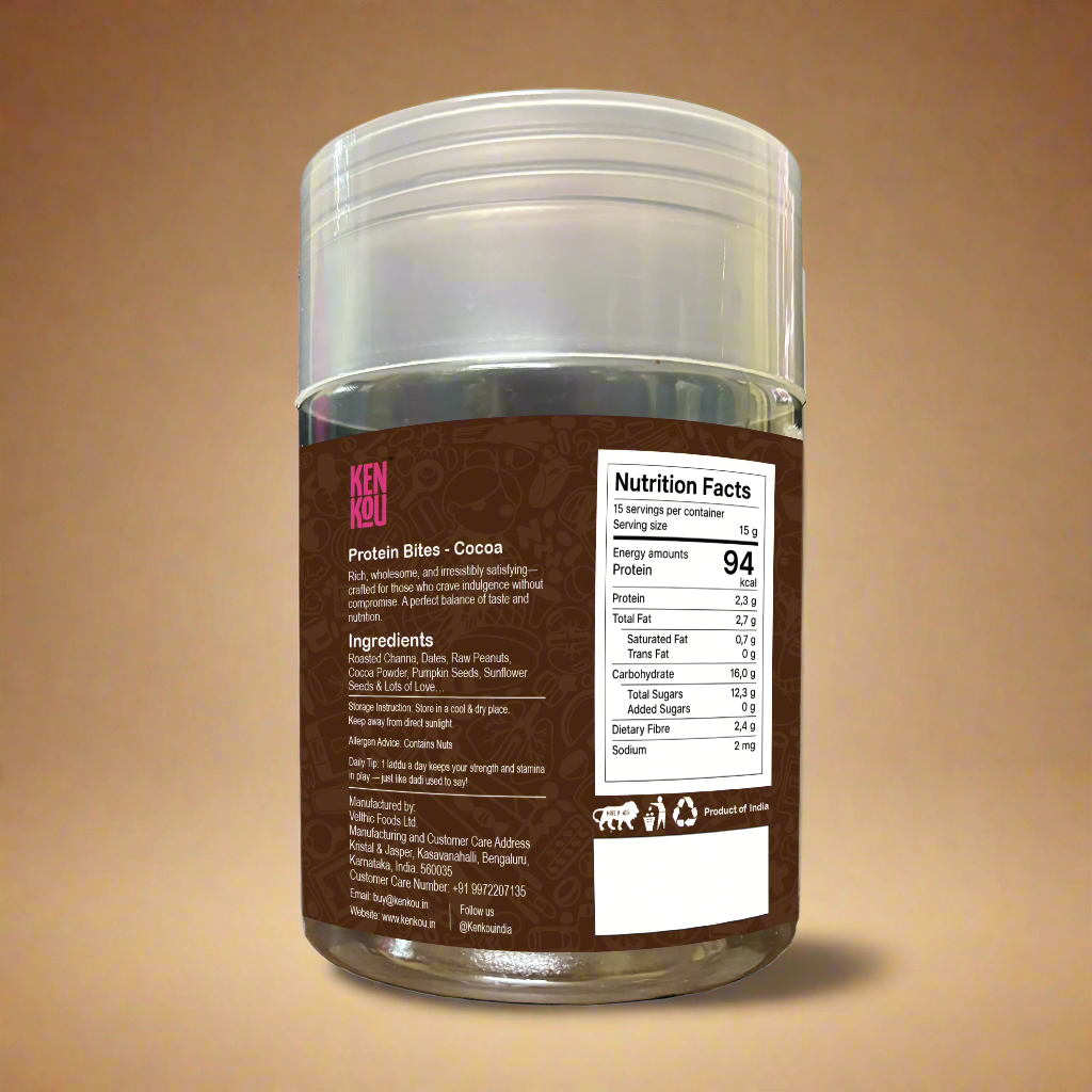 Don’t let the size fool you—Kenkou’s Cocoa Protein Bites are small but mighty. Made with roasted channa, raw peanuts, dates, and a touch of real cocoa, they deliver a solid punch of plant protein, fiber, and healthy fats with zero junk. The perfect bite for your cravings, workouts, or just staying human in a busy world.